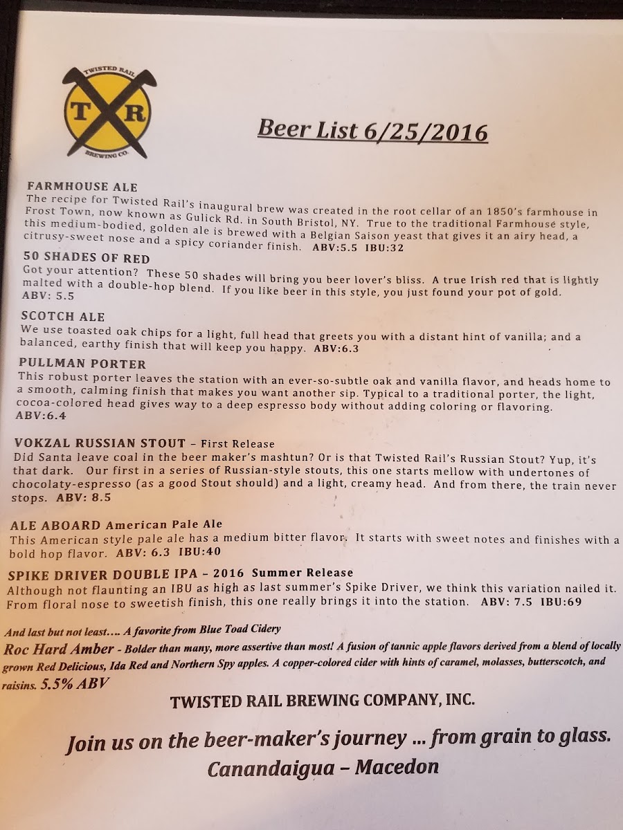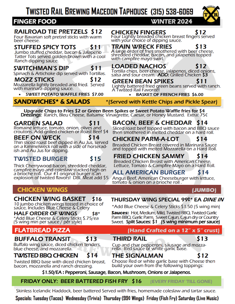 Welcome to Twisted Rail Brewing Macedon, a culinary gem nestled in Macedon, NY. Located at 108 Main St, this vibrant brewery offers an exciting menu that perfectly complements its craft beer selection. Begin your journey with irresistible Railroad Tie Pretzels, served with warm beer cheese—a satisfying starter that speaks to comfort. The light and crispy Fried Cauliflower, available in both classic and buffalo styles, will awaken your taste buds. For something heartier, the juicy burgers, like the mouthwatering Black Bean Burger, are renowned for their flavor and quality.